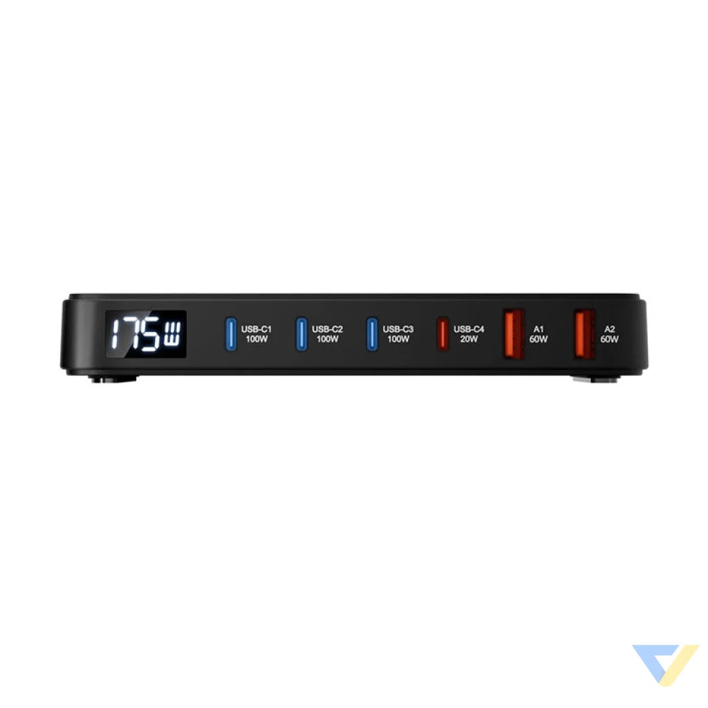 Salida USB-C1/C2/C3: 5V/3A, 9V/3A, 12V/3A, 15V/3A, 20V/5A (100W máx.); Salida USB-C4: 5V/3A, 9V/2.22A, 12V/1.67A (20W máx.); Salida USB-A1/A2: 5V/3A, 9V/3A, 12V/3A, 15V/3A, 20V/3A (60W máx.); Resultado A1+A2: 5V/2A+5V/2A; Salida C4+A1: 5V/2A+5V/2A; Salida C4+A1+A2: 5V/2A+5V/2A+5V/2A; Resultado C1+C2 o C1+C3 o C2+C3: 65W+45W; Salida C1+C2+C3: 65W+30W+20W; Salida C1+C2+C3+C4: 65W+30W+20W+20W; Resultado C1+C2+C3+A1/A2: 65W+30W+20W+60W; Salida C1+C2+C3+C4+A1+A2: 65W+30W+20W+10W+5V/2A+5V/2A; Resultado total: 175W máx. |