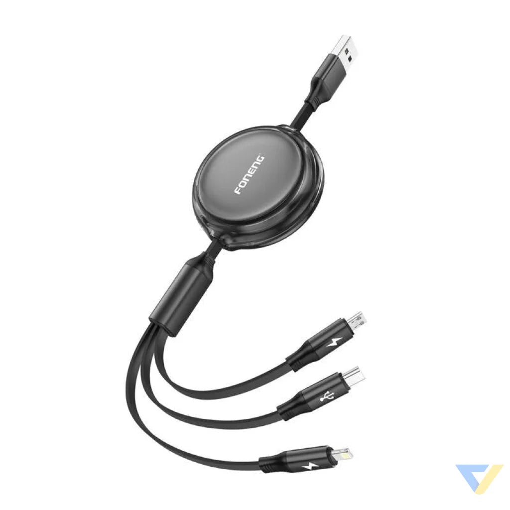 The 3-in-1 Foneng X113 cable combines functionality with modern design. Thanks to its telescopic design with adjustment in several levels, this cable becomes an indispensable accessory for charging Android and Apple devices. With a length of 1.1 meters and a flexible material, it is convenient to use in a variety of conditions, and its unique design makes it a cable that stands out from the rest.