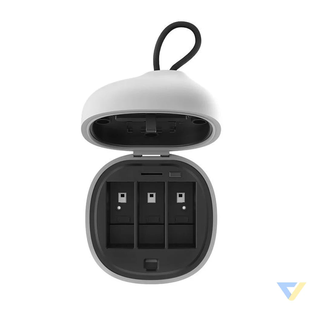 Зарядное устройство отличается стильным, но функциональным дизайном. Оно позволяет хранить 3 аккумулятора и 3 TF-карты. Весит всего 147,6 г, а благодаря компактным размерам вы легко можете положить его в рюкзак или сумку. Транспортировка устройства облегчается коротким шнурком, с помощью которого можно прикрепить его к сумке или повесить на палец. Кроме того, степень защиты IP54 означает, что вам не нужно беспокоиться о возможных случайных брызгах на зарядное устройство.