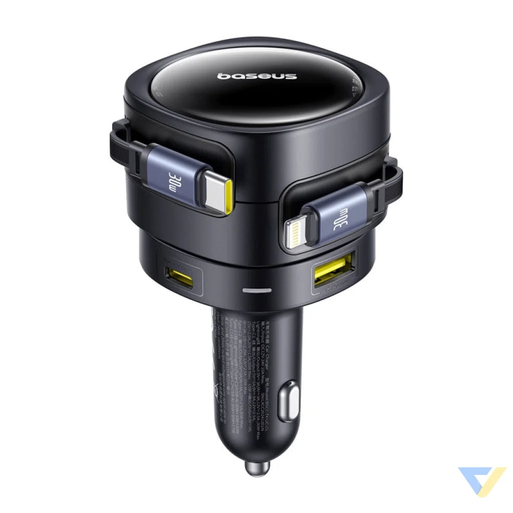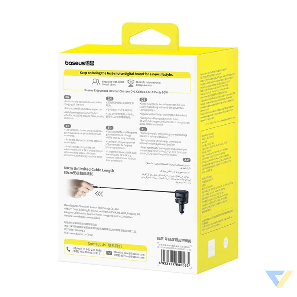 The Baseus car charger with two built-in cables (USB-C and Lightning) and two additional ports (USB-C and USB-A) allows you to charge up to four devices simultaneously with a total power of up to 90 watts. The integrated safety system, swivel design and 12-24 volt compatibility ensure reliability in any vehicle.