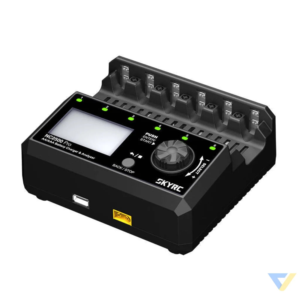 The SkyRC NC2500 Pro charger allows not only charging AA and AAA batteries, but also regenerating them. The device offers several different modes of operation, and has the added advantage of a run-in function that allows you to run-in model motors that have not been used for a long time. You also have a USB port that supports QC 3.0 fast charging, and the charger is equipped with 6 battery slots.