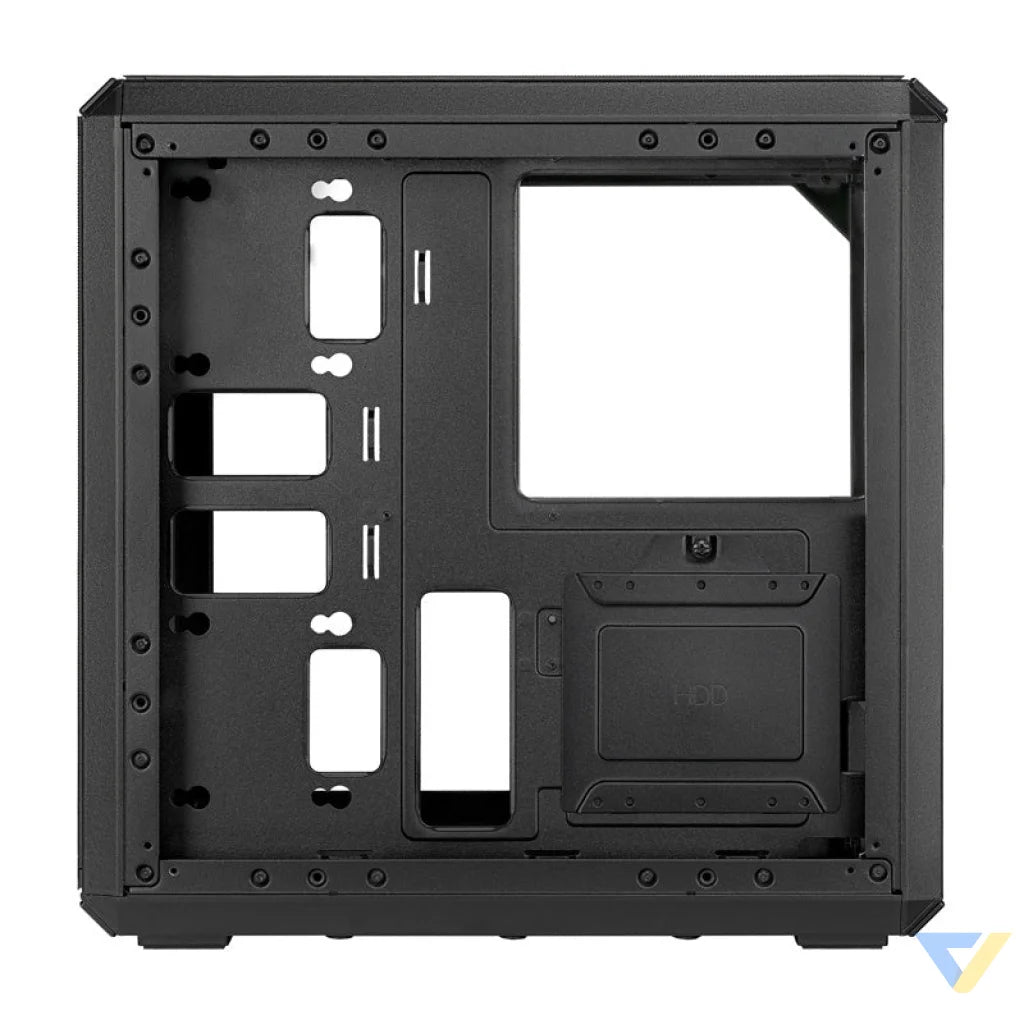 The case can accommodate up to six fans: two at the front, two at the top, one at the back and one at the bottom. It is also possible to install a water cooler of up to 240 mm. Perforated panels on the front, top and bottom allow air to flow freely.