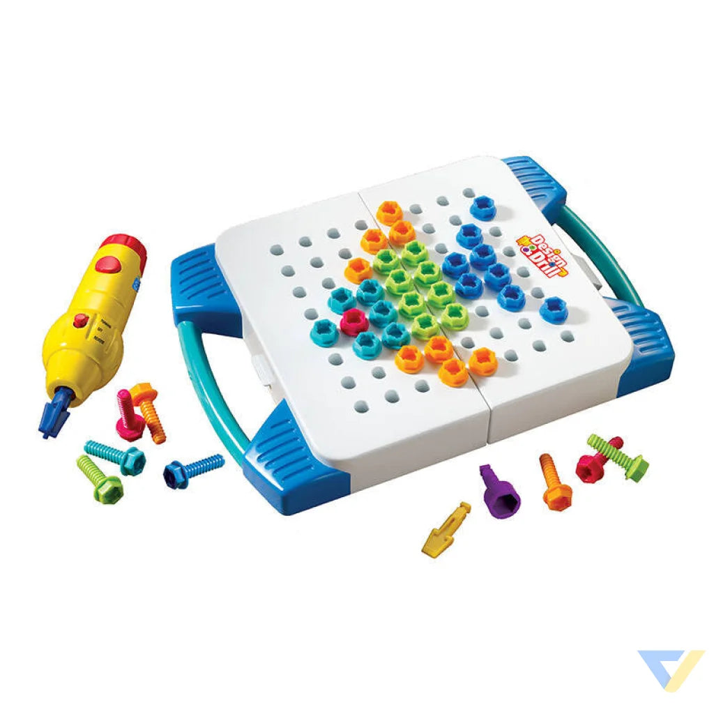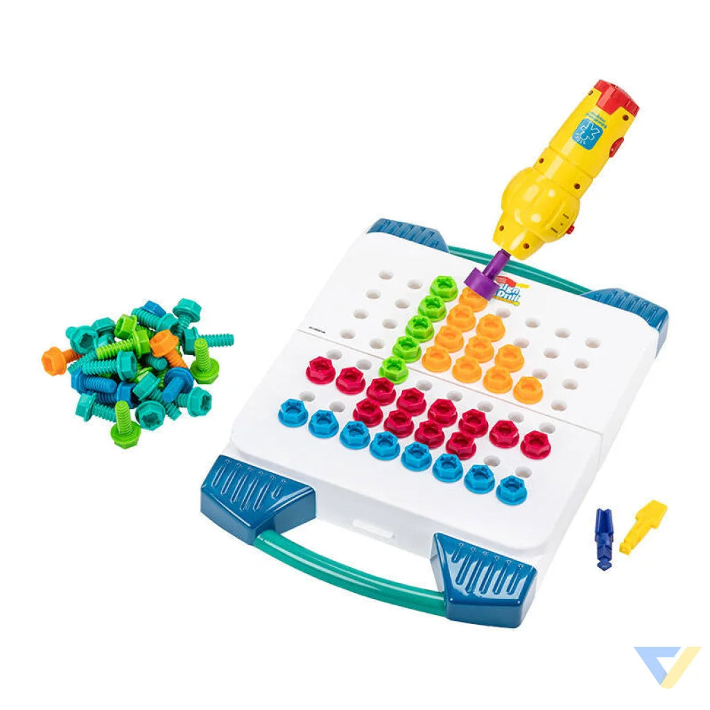 The set consists of a drill/driver, colorful screws and a plate that serves as both a base for constructing a variety of designs and a carrying case. The drill/driver is used to place and tighten screws in the holes on the plate, allowing children to create their own patterns or follow instructions from the guide. As a result, little engineers can develop eye-hand coordination, planning and problem-solving skills, as well as manual skills.