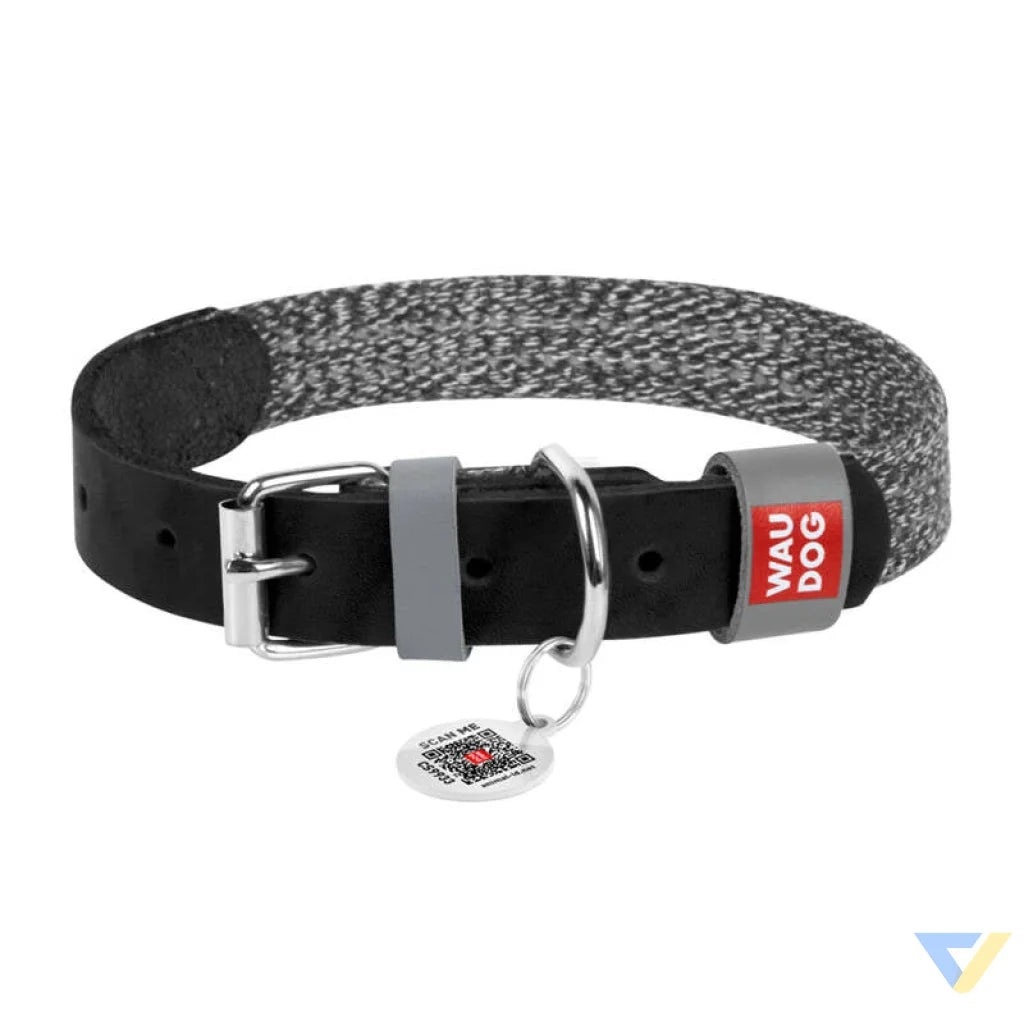 Dog collar in natural leather and recycled material with QR code Waudog size S, width 15 mm (black).