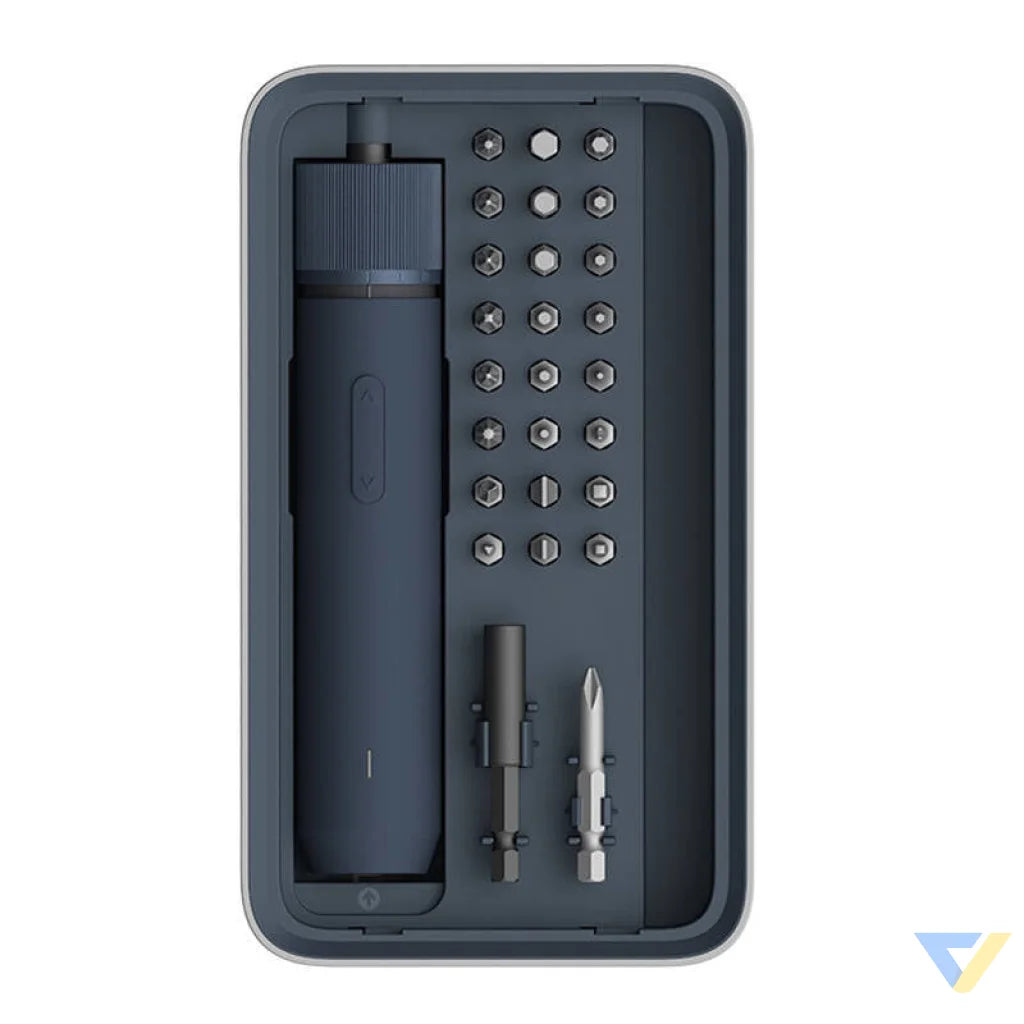The screwdriver and bits are housed in a rectangular case, distinguished by its minimalist design. Thanks to the built-in magnets, you can conveniently store them in one place without worrying about losing any of the items in the set. In addition, the case is easy to open and close.