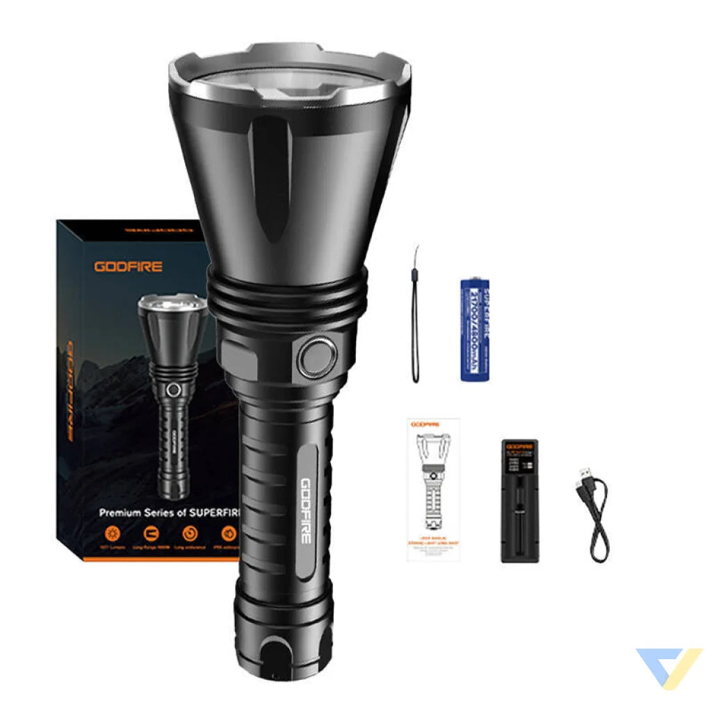The Superfire TF01 flashlight is a high-quality device designed for users who need reliable and efficient lighting in a variety of conditions. The flashlight offers an impressive range of up to 1,000 meters in Turbo mode and various brightness levels to suit the user's needs. With a capacious 4800 mAh battery, the Superfire TF01 provides long-lasting operation, reaching up to 52 hours in Low mode.