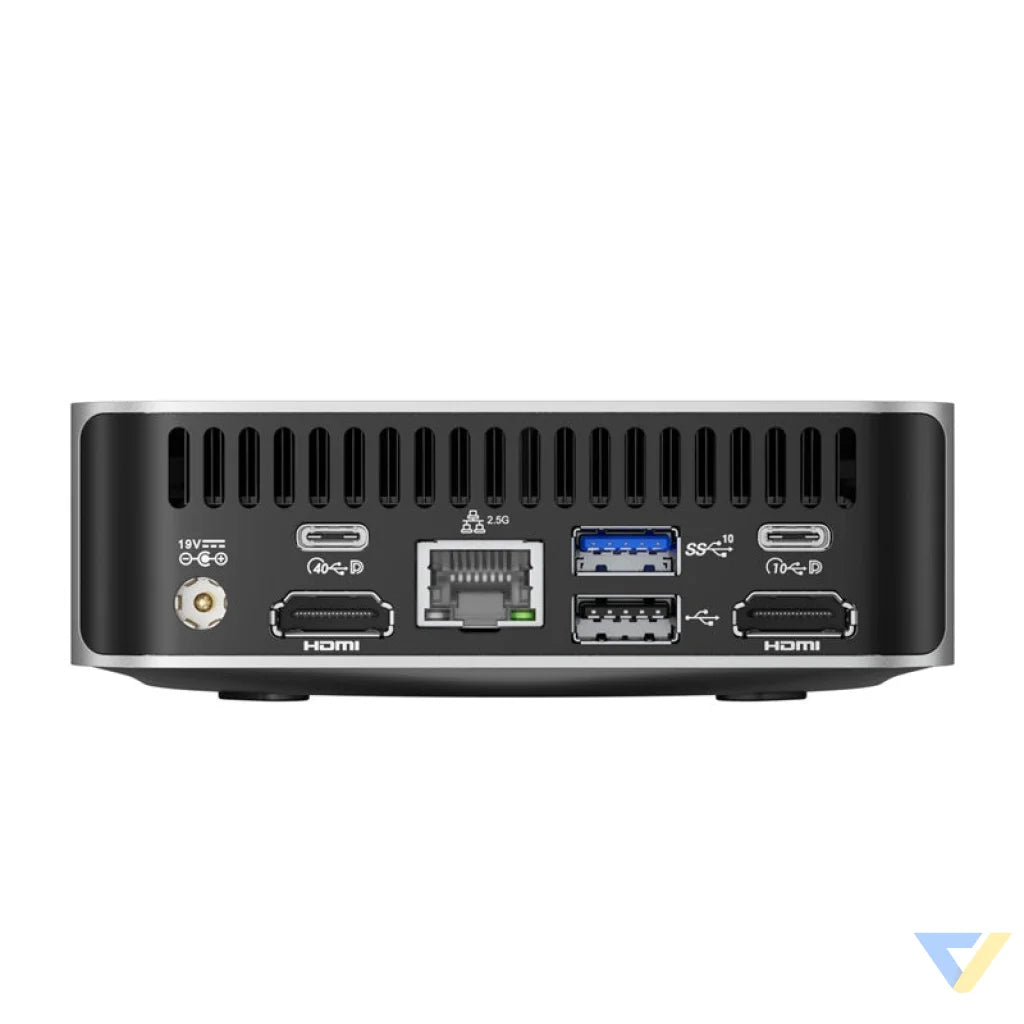 1x USB-A 3.2 Gen 2 (rear panel), 1x USB-A 2.0 (rear panel), 1x USB-A 3.2 Gen 2 with Power Delivery (front panel), 1x USB-A 3.2 Gen 2 (front panel), 1x USB-C 3.2 with Power Delivery (rear panel), 1x USB-C 4.0 Gen 3 with Power Delivery support (rear panel) 1x 3.5mm stereo headphone jack (front panel), 1x RJ45 (rear panel) RTL8125BG-CG, 2x HDMI 2.0 (rear panel), 1x DC input (rear panel), 1x power button, 1x SD card reader |
