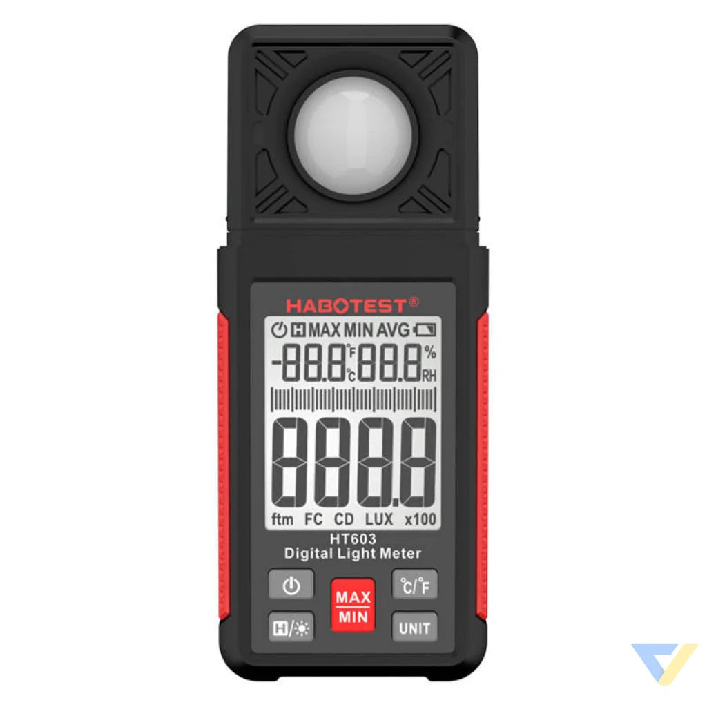 Habotest HT603 используется для измерения интенсивности света в диапазоне 0~100000 LUX / 0~10000 FC. Он отлично подходит для таких областей, как электротехника или для инспекции помещений. Отличается быстрым временем отклика, а вращающийся зонд делает его более удобным в использовании. Кроме того, с помощью устройства можно измерять уровень влажности окружающей среды и температуру. Питание HT603 осуществляется от 3 батареек AAA.