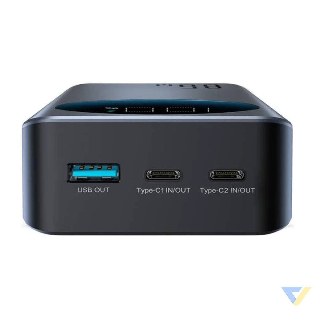 The Joyroom JR-PBF05 allows you to charge up to three devices simultaneously thanks to its three output ports. The USB port offers 30W and supports the QC3.0 fast charging standard, while the two Type-C ports support PD3.0 technology and deliver up to 65W of power. This is ideal for simultaneously charging a laptop, smartphone and headphones without worrying about overloading. As an added bonus, the smart, large digital display shows the remaining power level and fast charging icon, giving you full control over your device's performance.