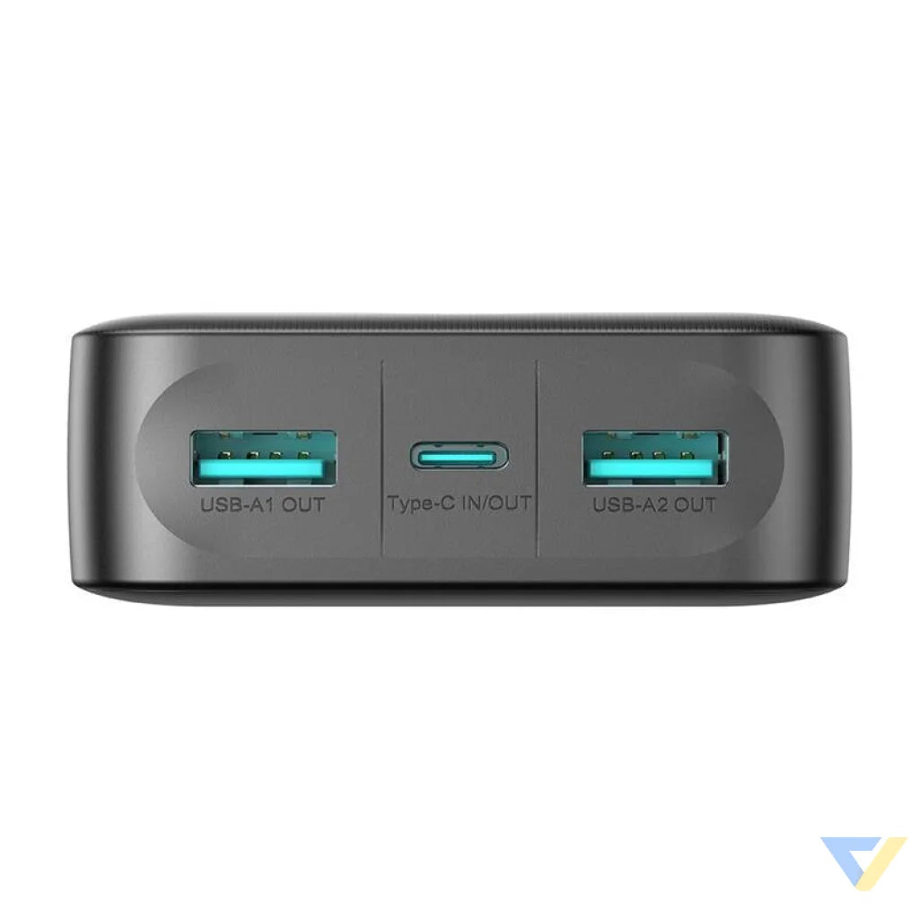 The powerbank is equipped with ports that allow you to charge up to three devices simultaneously. Two USB-A ports (12W each) and a Type-C port (12W) allow you to charge phones, tablets, headphones and other devices at the same time, without having to stop charging one to plug in another.