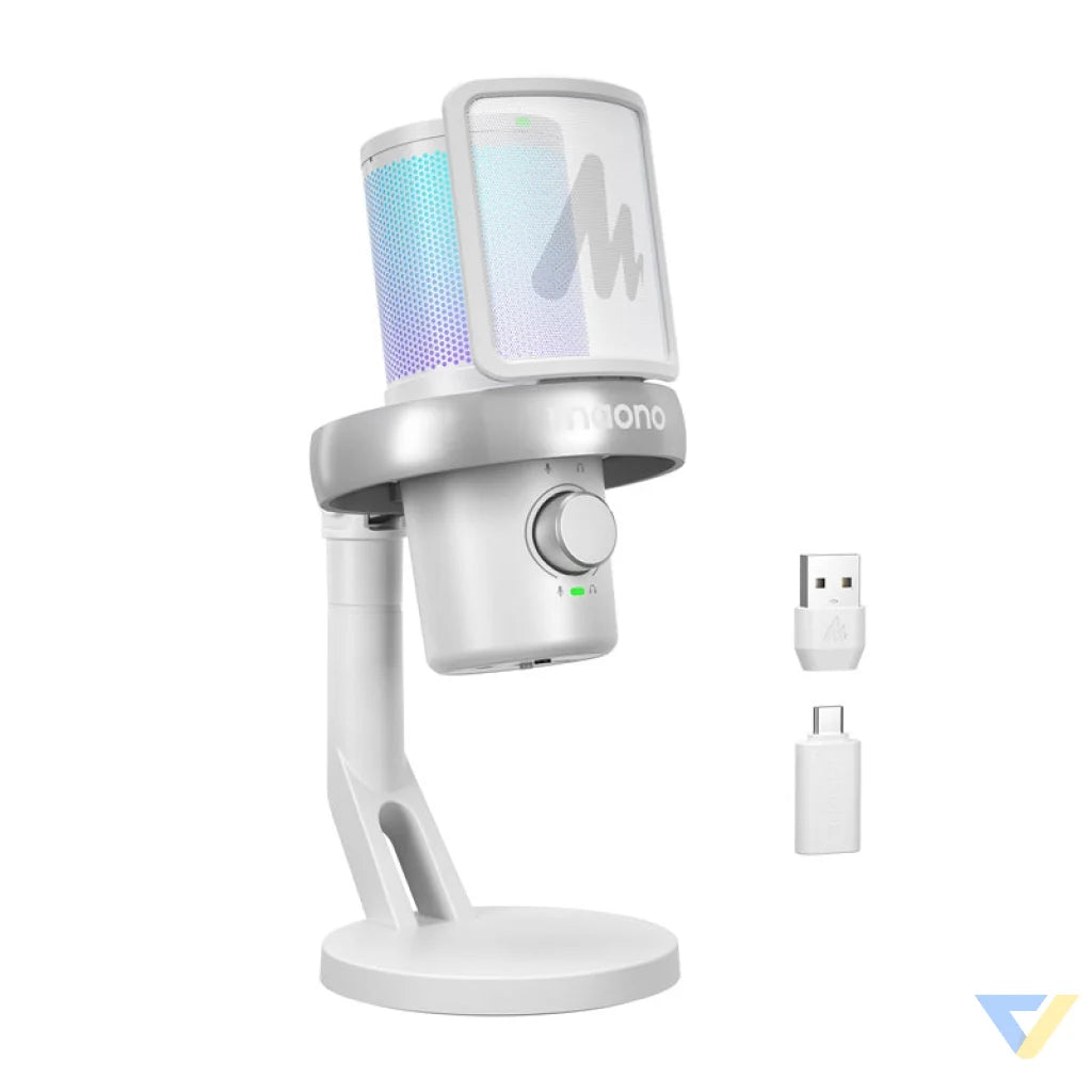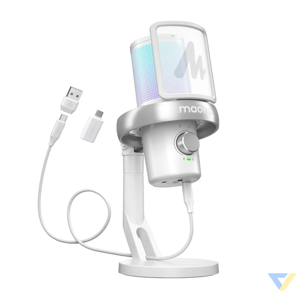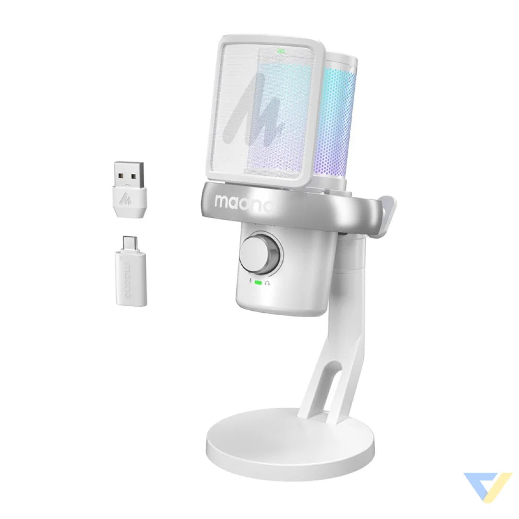 The microphone's aesthetics are complemented by built-in RGB backlighting with more than 16 million possible color settings. There are 3 lighting modes and 13 predefined colors that can be personalized in the Maono Link app. Microphone and listening volume controls, quick sound source switching and a mute button are located on the device's front panel for intuitive operation without reaching for a computer.