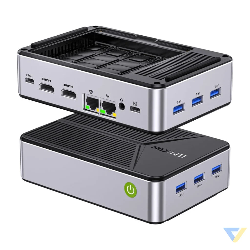 GMKtec NucBox G9 is an advanced mini PC designed for users who need a compact yet powerful solution for data storage, work and entertainment. It is equipped with a state-of-the-art Intel Twin Lake N150 processor (4 cores, 6 MB cache, up to 3.60 GHz) and combines the functionality of a desktop PC and a NAS server. Among other features, it offers 12GB of LPDDR5 memory, 64GB of built-in eMMC memory, up to four M.2 2280 PCIe 3.0 SSD slots and two 2.5G LAN ports. All this makes it an ideal choice for backup, streaming, data work and more. The NucBox G9 also comes with Windows 11 Pro installed.