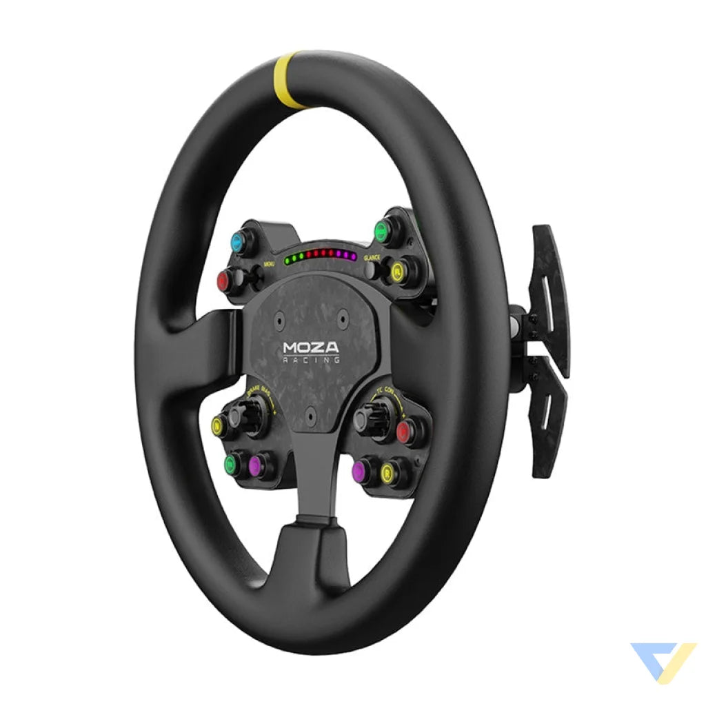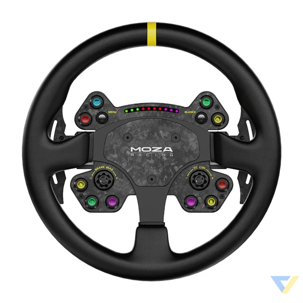 Meet the Moza Racing RS V2 RS25 steering wheel - professional equipment for the most demanding simracing fans. Equipped with a 13-inch race standard size rim, magnetic paddles, programmable buttons and RGB backlighting, it offers a realistic experience behind the wheel. Made of forged carbon fiber and finished in natural leather, it combines durability with a luxurious look. The ergonomic layout and Quick Release mounting system make it an ideal choice for gamers looking for maximum control and authentic thrills.