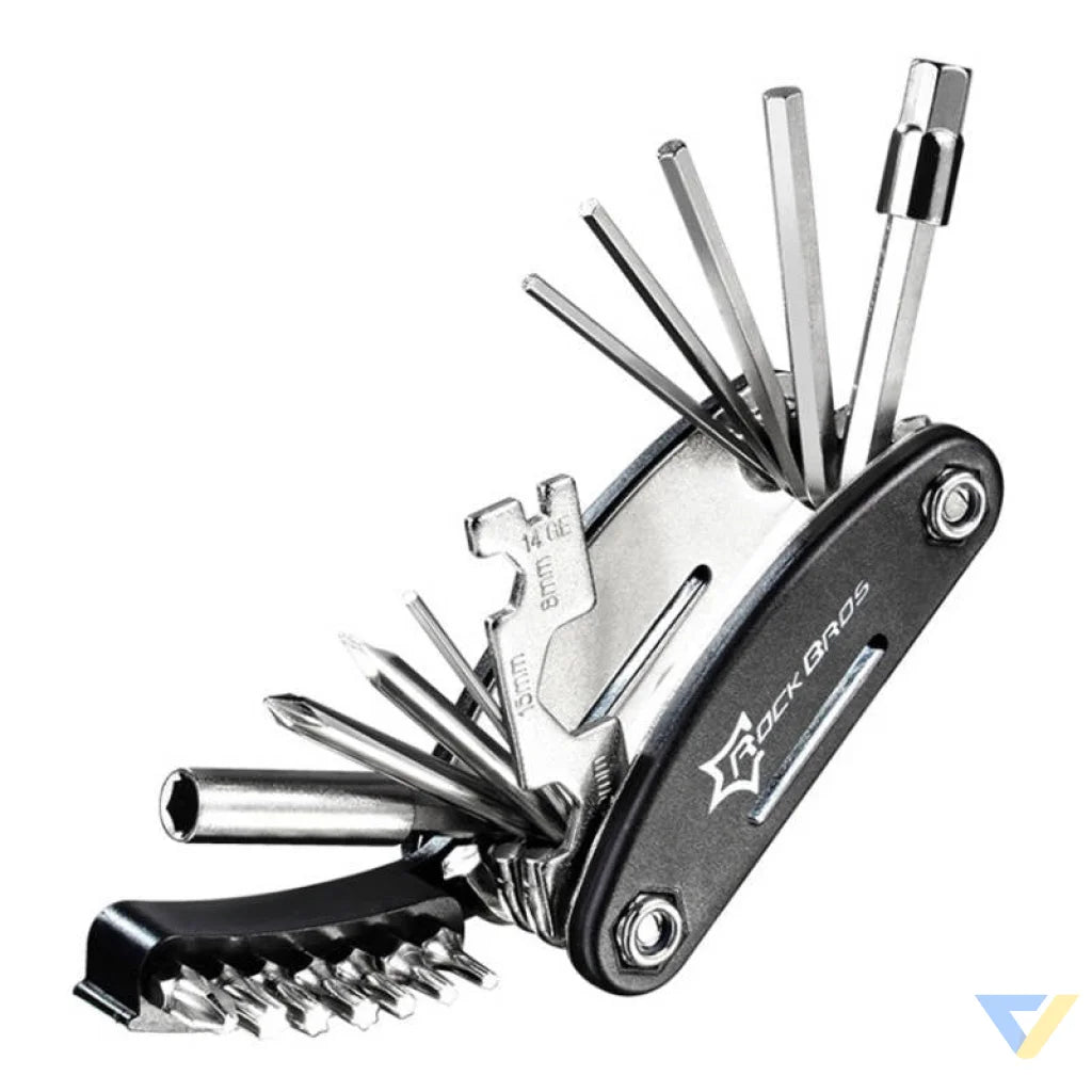 When you buy the Rockbros GJ8002 pocket knife, you get up to 16 different tools. The multitool offers a socket spanner with a set of sockets (PH2, T30, T27, T25, T20, T15, T10), a Phillips screwdriver, a flathead screwdriver, a set of spanners (8mm, 10mm, 15mm) and Allen keys (1mm, 2mm, 3mm, 4mm, 5mm, 10mm). So you can tighten a loose screw or repair a minor fault at any time!