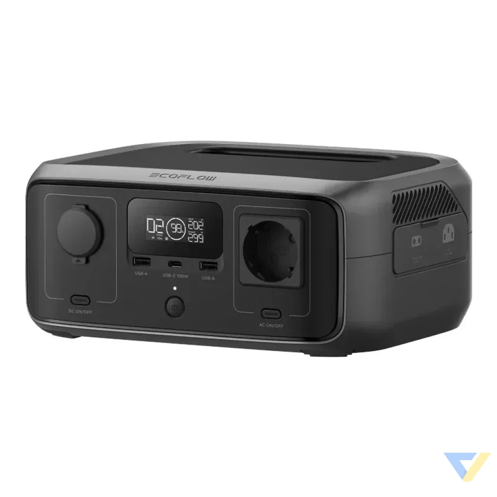 Power and charge multiple devices simultaneously. The EcoFlow RIVER 3 portable UPS station is equipped with one 300-watt AC outlet to power household appliances, laptops or lighting. There are also two USB-A ports (12 watts each, for a total of 24 watts), one USB-C port with as much as 100 watts of power, and a car outlet with 12.6 volts and 100 watts of power. So you can connect smartphones, tablets, laptops, cameras, travel coolers or fans to it.
