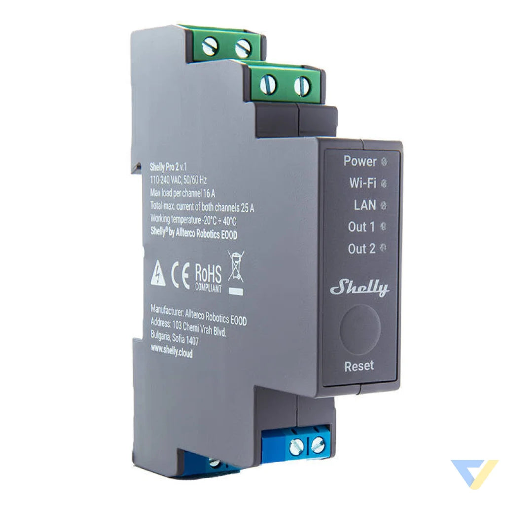 Shelly Pro 2 is an advanced DIN rail relay with two independent channels. Each channel supports a load of up to 16 A, with a total capacity of 25 A. With support for WiFi, LAN, and Bluetooth, it is well-suited for both home and building automation. It also integrates with popular voice assistants like Google Assistant, Samsung SmartThings, and Amazon Alexa, making home control even more convenient. Equipped with potential-free contacts, it provides great flexibility in handling various voltages and offers a wide range of possibilities in home automation. Furthermore, scripting features allow the creation of custom automation scenes based on various events, such as weather forecasts.