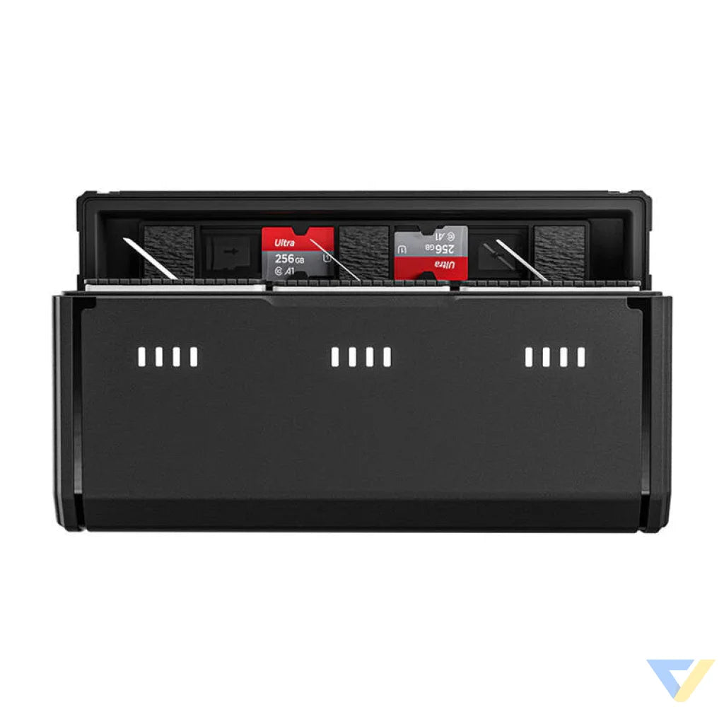 The TELESIN charger features a slim and compact design with a thickness of just 2.5 cm, making it easy to store in a pocket or bag. It has a side USB-C charging port for added convenience, allowing you to easily connect the cable in various situations. The charger's high-quality ABS material is fireproof, dustproof and drop-proof, ensuring long device life and the safety of stored batteries.