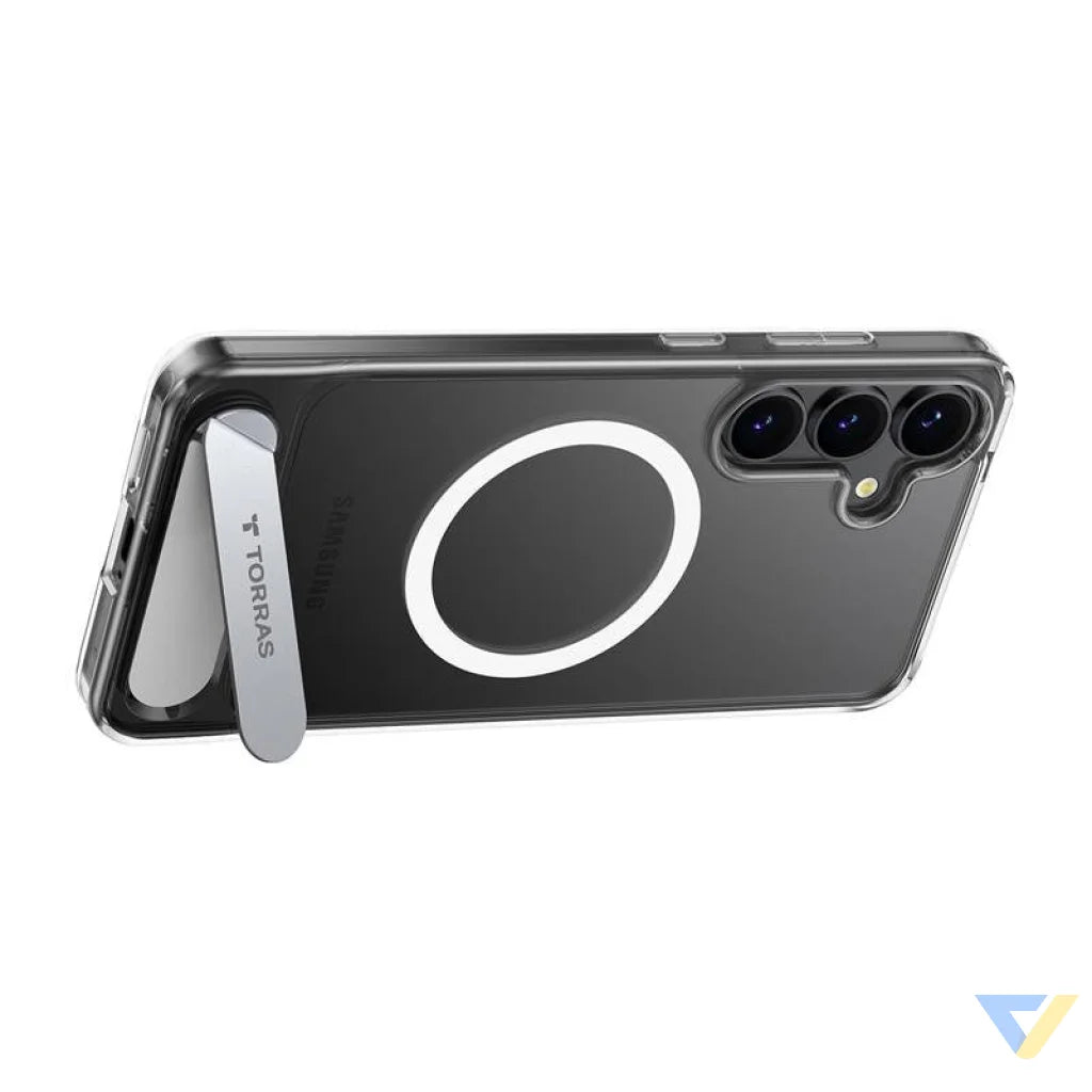 The Torras Pstand case for Samsung S25+ features a magnetic design and offers a stable stand for comfort and protection of your device. It also allows fast wireless charging, and compatibility with magnetic accessories enhances its functionality.